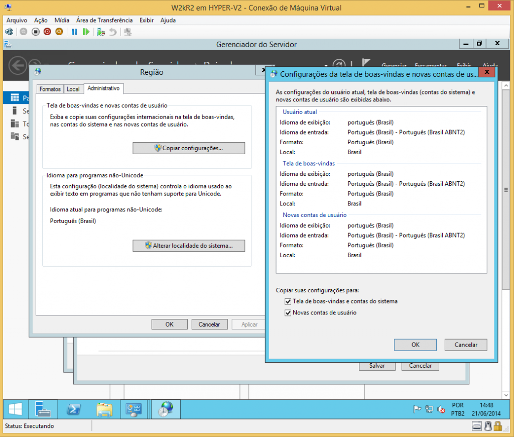 O Processo de instalação é básico, escolha de espaço no disco em qual instalá-lo, senha de administrador e por fim a tela inicial pós instalação o Server Manager – Dashboard.2. Configuração de Idioma