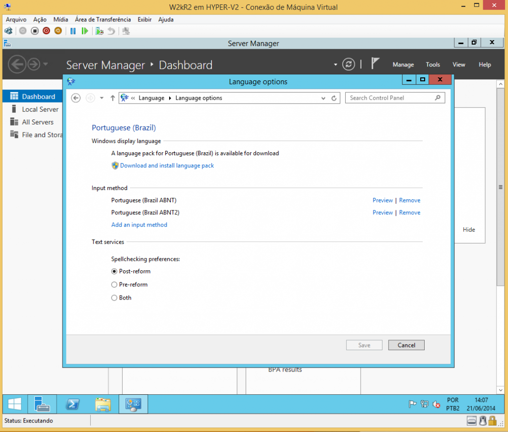 O Processo de instalação é básico, escolha de espaço no disco em qual instalá-lo, senha de administrador e por fim a tela inicial pós instalação o Server Manager – Dashboard.2. Configuração de Idioma